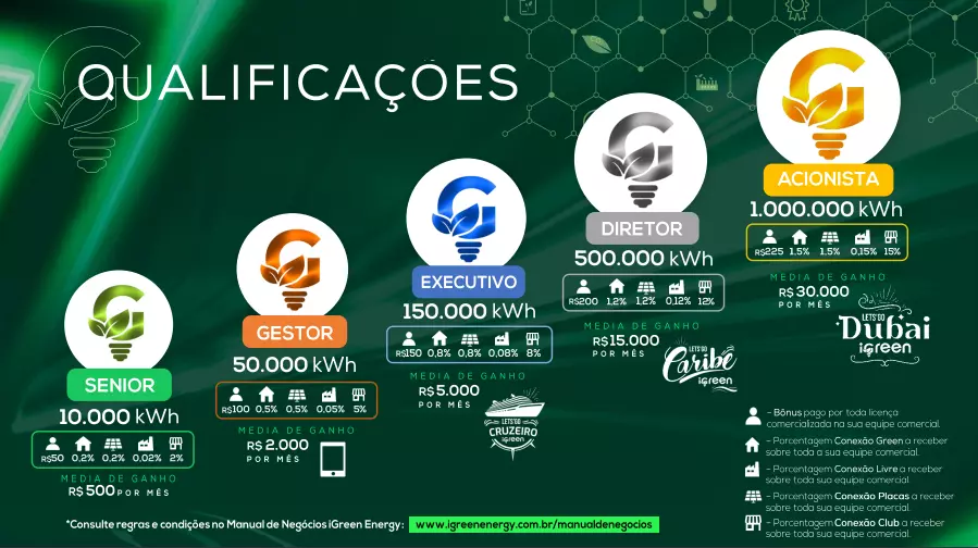 O plano de carreira da iGreen Energy é projetado para reconhecer e recompensar o esforço e o desempenho dos nossos licenciados. À medida que você cresce na empresa e atinge novos níveis, você pode receber prêmios e comissões maiores.